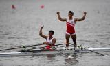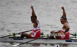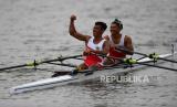 Pedayung Ardi Risedi dan Kakan Rusmana berselebrasi usai mencapai garis finis di urutan pertama dalam babak final nomor lightweight man’s double scull cabana saying SEA Games 2021 di Hai Phong, Vietnam, Rabu (11/5/2022). Ardi dan Kakan memenangkan medali emas yang pertama bagi kontingen Indonesia dalam SEA Games Vietnam. (FOTO : ANTARA/Aditya Pradana Putra)