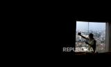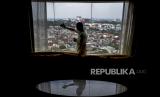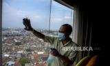 Pekerja membersihkan kaca di salah satu kamar di Sensa Hotel Bandung, Jalan Cihampelas, Kota Bandung, Rabu (11/5/2022). Kepala Dinas Kebudayaan dan Pariwisata Kota Bandung Kenny Dewi Kaniasari mengatakan total kunjungan wisata berdasarkan tingkat okupansi hotel mencapai 77,5 persen pada masa libur Lebaran 2022. Peningkatan tersebut dapat menjadi salah satu pendongkrak kebangkitan perekonomian Kota Bandung khususnya di sektor pariwisata. Foto: Republika/Abdan Syakura (FOTO : REPUBLIKA/ABDAN SYAKURA)