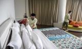 Pekerja membersihkan area kamar hotel di Sensa Hotel Bandung, Jalan Cihampelas, Kota Bandung, Rabu (11/5/2022). Kepala Dinas Kebudayaan dan Pariwisata Kota Bandung Kenny Dewi Kaniasari mengatakan total kunjungan wisata berdasarkan tingkat okupansi hotel mencapai 77,5 persen pada masa libur Lebaran 2022. Peningkatan tersebut dapat menjadi salah satu pendongkrak kebangkitan perekonomian Kota Bandung khususnya di sektor pariwisata. Foto: Republika/Abdan Syakura (FOTO : REPUBLIKA/ABDAN SYAKURA)