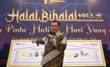 Direktur Utama Bank BTN Haru Koesmahargyo membubuhkan cap telapak tangan pada acara Halal Bihalal Bank BTN dengan Stakeholder dari Asosiasi Pengembang, Kementerian PUPR, Kementerian Keuangan, BP Tapera dan PT Sarana Multigriya Finansial (SMF) di Jakarta, Rabu (11/5). Pembubuhan cap telapak tangan merupakan simbolik dari komitmen Bank BTN dan para stakeholder dalam berkolaborasi membangun rumah rakyat dengan tema Growth Through Collaboration in Diversity. (FOTO : Dok. BTN)