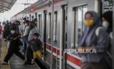 Sejumlah penumpang turun dari KRL di Stasiun Manggarai, Jakarta, Jumat (13/5/2022). Kementerian Perhubungan berencana menaikan tarif KRL Commuter Line menjadi Rp 5.000 untuk perjalanan 25 kilometer dari sebelumnya sebesar Rp 3.000. Republika/Putra M. Akbar (FOTO : Republika/Putra M. Akbar)