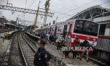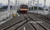 KRL saat akan tiba di Stasiun Manggarai, Jakarta, Jumat (13/5/2022). Kementerian Perhubungan berencana menaikan tarif KRL Commuter Line menjadi Rp 5.000 untuk perjalanan 25 kilometer dari sebelumnya sebesar Rp 3.000. Republika/Putra M. Akbar (FOTO : Republika/Putra M. Akbar)