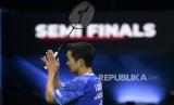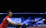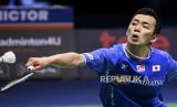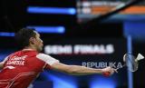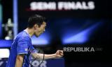 REPUBLIKA.CO.ID,BANGKOK -- Pebulu tangkis tunggal putra Indonesia Jonatan Christie mengembalikan kok ke arah lawannya pebulu tangkis tunggal putra Jepang Kenta Nishimoto dalam pertandingan babak semifinal Piala Thomas 2022 di Impact Arena, Bangkok, Thailand, Jumat (13/5/2022). Jonatan Christie kalah dari Kenta Nishimoto dengan skor 20-22 dan 13-21.