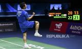 Ekspresi dari pebulu tangkis tunggal putra Jepang Kenta Nishimoto usai mengalahkan pebulu tangkis tunggal putra Indonesia Jonatan Christie dalam pertandingan babak semifinal Piala Thomas 2022 di Impact Arena, Bangkok, Thailand, Jumat (13/5/2022). Kenta Nishimoto kalahkan Jonatan Christie dengan skor 22-20 dan 21-13. (FOTO : ANTARA/M Risyal Hidayat)