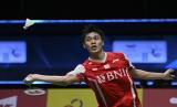 Ekspresi dari pebulu tangkis tunggal putra Indonesia Shesar Hiren Rhustavito usai mengalahkan pebulu tangkis tunggal putra Jepang Kodai Naraoka dalam pertandingan babak semifinal final Piala Thomas 2022 di Impact Arena, Bangkok, Thailand, Jumat (13/5/2022). Rhustavito menang dengan skor 21-17 dan 21-11 sekaligus mengantar Tim Thomas Indonesia ke final setelah menang 3-2. dari tim Thomas Jepang. (FOTO : Antara/M Risyal Hidayat)