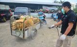 Petugas menyemprotkan cairan disinfektan di Pasar Hewan, Kudus, Jawa Tengah, Sabtu (14/5/2022). Penyemprotan dari Dinas Pertanian dan Pangan (Dispertan) itu guna mencegah penyebaran wabah virus PMK (Penyakit Mulut dan Kuku) pada hewan ternak. (FOTO : ANTARA/Yusuf Nugroho)
