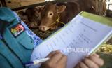 Petugas Dinas Ketahanan Pangan dan Pertanian (DKPP) Kota Bandung mencatat hasil pemeriksaan hewan sapi di salah satu lokasi penjulan hewan kurban di Sukahaji, Kecamatan Babakan Ciparay, Kota Bandung, Selasa (17/5/2022). Pemeriksaan tersebut guna mencegah dan mengantisipasi penyebaran wabah penyakit mulut dan kuku (PMK) pada hewan ternak yang sudah merebak di sejumlah daerah. Foto: Republika/Abdan Syakura (FOTO : REPUBLIKA/ABDAN SYAKURA)