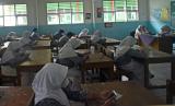 REPUBLIKA.CO.ID,SERANG -- Sejumlah siswa SMP Negeri 10 mengerjakan ujian akhir sekolah (UAS) berbasis android atau menggunakan telepon seluler (ponsel) di Kota Serang, Banten, Rabu (18/5/2022).