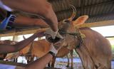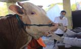 REPUBLIKA.CO.ID, INDRAMAYU -- Dokter Hewan dari Dinas Ketahanan Pangan dan Pertanian (DKPP) Indramayu memeriksa sapi yang baru tiba di Rumah Pemotongan Hewan (RPH) Indramayu, Jawa Barat, Rabu (18/5/2022). Pemprov Jawa Barat akan menerapkan Micro Lockdown atau Pembatasan Mikro hewan ternak untuk mencegah penyebaran Penyakit Mulut dan Kuku (PMK) dengan memperketat pemeriksaan hewan ternak yang masuk ke Jawa Barat.