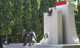 Menkopolhukam Mahfud MD (tengah) berjalan seusai meletakkan karangan bunga di Monumen Taman Makam Pahlawan Seroja di Kota Dili, Timor Leste, Kamis (19/5/2022). Taman Makam Pahlawan Seroja merupakan tempat pemakaman para prajurit Indonesia yang gugur di Timor Leste. (FOTO : ANTARA/Galih Pradipta)
