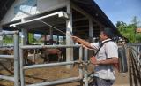 Petugas menyemprotkan cairan disinfektan di kandang Rumah Potong Hewan (RPH), Desa Lambaro, Kabupaten Aceh Besar, Aceh, Kamis (19/5/2022). Penyemprotan cairan disinfektan, khususnya di Rumah Potong Hewan (RPH) dan pemeriksaan kesehatan itu untuk mencegah penyebaran penyakit mulut dan kuku pada hewan yang kasusnya sejak sepekan terakhir meningkat menjadi sebanyak 5.159 ekor ternak sapi terindikasi PMK di Aceh. (FOTO : ANTARA/Ampelsa)