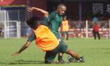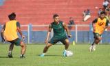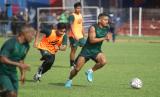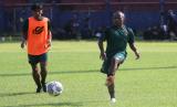 Pemain baru Persik Kediri Fernando Pahabol (kanan) mengikuti latihan perdananya di Stadion Brawijaya, Kota Kediri, Jawa Timur, Sabtu (21/5/2022). Mantan kapten Persipura Jayapura tersebut dikontrak Persik Kediri selama tiga tahun ke depan atau selama dua musim pertandingan kompetisi Liga 1.  (FOTO : ANTARA/Prasetia Fauzani)