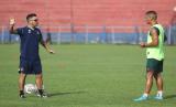 Pemain baru Persik Kediri Renan Da Silva (kanan) mendapatkan arahan dari pelatih Javier Roca (kiri) saat mengikuti latihan perdananya di Stadion Brawijaya, Kota Kediri, Jawa Timur, Sabtu (21/5/2022). Pemain asal Brasil itu direkrut untuk memperkuat tim guna mengikuti kompetisi Liga 1.  (FOTO : ANTARA/Prasetia Fauzani)