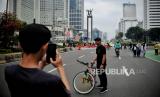 REPUBLIKA.CO.ID,JAKARTA -- Warga berfoto saat Hari Bebas Kendaraan Bermotor ( HBKB) di kawasan Sudirman, Jakarta Pusat, Ahad (22/5/2022).