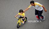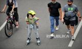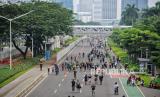 Warga berolahraga di kawasan Jalan Sudirman, Jakarta Pusat, Ahad (22/5/2022). Pemerintah Provinsi (Pemprov) DKI Jakarta kembali menggelar Hari Bebas Kendaraan Bermotor (HBKB) di sejumlah ruas jalan Ibu Kota seiring dengan masa transisi menuju endemi setelah melandainya kasus Covid-19 di DKI Jakarta. HBKB tersebut digelar mulai pukul 06.00 – 10.00 WIB dalam rangka meningkatkan kualitas udara di Jakarta. Republika/Thoudy Badai (FOTO : Republika/Thoudy Badai)