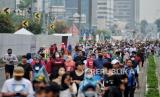 Warga memadati area Jalan Sudirman untuk berolahraga dan melakukan beragam aktivitas di kawasan Bundaran Hotel Indonesia (HI), Jakarta Pusat, Ahad (22/5/2022). Pemerintah Provinsi (Pemprov) DKI Jakarta kembali menggelar Hari Bebas Kendaraan Bermotor (HBKB) di sejumlah ruas jalan Ibu Kota seiring dengan masa transisi menuju endemi setelah melandainya kasus Covid-19 di DKI Jakarta. HBKB tersebut digelar mulai pukul 06.00 – 10.00 WIB dalam rangka meningkatkan kualitas udara di Jakarta. Republika/Thoudy Badai (FOTO : Republika/Thoudy Badai)