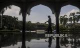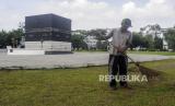 Petugas membersihkan rumput di dekat replika kabah di Asrama Haji Pondok Gede, Jakarta, Senin (23/5/2022). Asrama Haji Pondok Gede Jakarta siap melayani calon jamaah haji tahun 1443 Hijriah, yang dijadwalkan mulai masuk Asrama pada 3 Juni 2022 sebelum keberangkatan ke Tanah Suci Mekkah dan Madinah di Arab Saudi. (FOTO : Republika/Putra M. Akbar)