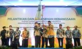 Ketua Majelis Pengurus Pusat (MPP) Ikatan Cendekiawan Muslim Indonesia (ICMI) Prof Arif Satria (kanan) menyerahkan bendera Pataka ICMI kepada Ketua Organisasi Wilayah (Orwil) ICMI Yogyakarta Prof Mahfud Sholihin usai pelantikan di Auditorium Kahar Mudzakkir, Universitas Islam Indonesia, Yogyakarta, Senin (22/5/2022). (FOTO : Wihdan Hidayat / Republika)