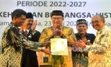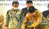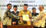 Ketua Majelis Pengurus Pusat (MPP) Ikatan Cendekiawan Muslim Indonesia (ICMI) Prof Arif Satria (kanan) menandatangani surat pelantikan Ketua Organisasi Wilayah (Orwil) ICMI Yogyakarta dan Pengurus 2022 hingga 2027 di Auditorium Kahar Mudzakkir, Universitas Islam Indonesia, Yogyakarta, Senin (22/5/2022). Pada kesempatan ini Ketua Orwil ICMI Yogyakarta Prof Mahfud Sholihin menggantikan Herry Zudianto sebagai ketua yang lama. (FOTO : Wihdan Hidayat / Republika)