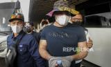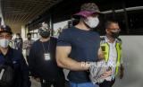 Penyidik menggiring salah satu pelaku kasus skimming berkewarganegaraan Bulgaria berinisial VT di Bandara Internasional Hang Nadim, Batam, Kepulauan Riau, Senin (23/5/2022). Direktorat Reserse Kriminal Khusus Polda Kepri berhasil menangkap tiga orang pelaku pencurian data nasabah Bank Riau Kepri cabang Batam di wilayah Provinsi Bali. (FOTO : ANTARA/Teguh Prihatn)