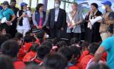 Deputi Sekjen PBB Amina J. Mohammed (kedua kanan) berbicara di depan siswa yang mengikuti latihan kesiapsiagaan bencana gempa dan tsunami di SD Negeri 2 Tanjung Benoa, Badung, Bali, Selasa (24/5/2022). Latihan tersebut diselenggarakan oleh United Nations Development Programme (UNDP) bekerja sama dengan BNPB sebagai bagian dari World Reconstruction Conference kelima (WRC5) yang digelar bersamaan dengan Global Platform for Disaster Risk Reduction (GPDRR) 2022 di Bali. (FOTO : ANTARA/Fikri Yusuf)