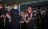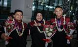 REPUBLIKA.CO.ID, TANGERANG -- Sejumlah atlet kontingen Indonesia di SEA Games 2021 Vietnam tiba di Bandara Internasional Soekarno Hatta, Tangerang, Banten, Selasa (24/5/2022). Kontingen Indonesia menduduki peringkat ketiga dengan perolehan 69 medali emas, 91 medali perak dan 80 medali perunggu.