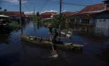 Anggota TNI Kodim 0710 Pekalongan mendayung perahu tradisional saat melewati genangan banjir rob di Tirto, Pekalongan, Jawa Tengah, Selasa (24/5/2022). Berdasarkan data Badan Penanggulangan Bencana Daerah (BPBD) Kota Pekalongan, adanya fenomena air laut pasang di pesisir pantai Utara Pekalongan berimbas sejumlah daerah di Kota Pekalongan mengalami banjir rob, dengan ketinggian rata-rata mencapai antara 5-70 centimeter. (FOTO : ANTARA/Harviyan Perdana Putra)