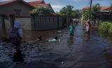 Sejumlah warga berjalan melewati jalan di sekitar rumahnya yang tergenang banjir rob di Tirto, Pekalongan, Jawa Tengah, Selasa (24/5/2022). Berdasarkan data Badan Penanggulangan Bencana Daerah (BPBD) Kota Pekalongan, adanya fenomena air laut pasang di pesisir pantai Utara Pekalongan berimbas sejumlah daerah di Kota Pekalongan mengalami banjir rob, dengan ketinggian rata-rata mencapai antara 5-70 centimeter. (FOTO : ANTARA/Harviyan Perdana Putra)
