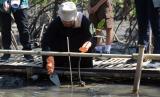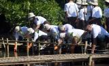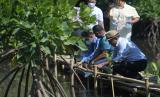 Sejumlah delegasi memanam pohon bakau saat aksi nyata Gerakan Nasional Revolusi Mental melalui Penanaman Sepuluh Juta Pohon dalam rangkaian Global Platform for Disaster Risk Reduction (GPDRR) 2022 di Pantai Mertasari, Denpasar, Bali, Selasa (24/5/2022). Kegiatan tersebut merupakan bagian dari gerakan pembudayaan gaya hidup cinta lingkungan. (FOTO : ANTARA/Nyoman Hendra Wibowo)