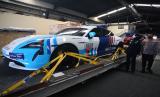 Petugas kepolisian berada disamping Safety Car untuk mengawasi bongkar muat logistik Formula E setibanya di Terminal Cargo Bandara Soekarno Hatta, Tangerang, Banten, Selasa (24/5/2022). ABB FIA Formula E World Championship seri kesembilan akan berlangsung di Sirkuit Formula E Ancol pada 4 Juni 2022. (FOTO : ANTARA/Muhammad Iqbal)