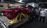 Kepala Bea Cukai Bandara Soekarno Hatta Finari Manan (kiri) bersama Kapolres Bandara Soekarno Hatta Kombes Pol Sigit Dany (kanan) melihat Safety Car saat memantau langsung bongkar muat logistik Formula E setibanya di Terminal Cargo Bandara Soekarno Hatta, Tangerang, Banten, Selasa (24/5/2022). ABB FIA Formula E World Championship seri kesembilan akan berlangsung di Sirkuit Formula E Ancol pada 4 Juni 2022. (FOTO : ANTARA/Muhammad Iqbal)