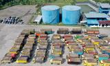 Foto udara antrean truk pengangkut tebu di Pabrik Gula PT Rejoso Manis Indo (RMI) Blitar, Jawa Timur, Rabu (25/5/2022). PT RMI menargetkan produksi gula di musim giling 2022 mencapai 67ribu ton gula, dari sekitar 1,1juta ton tebu petani dengan target rendemen mencapai 8,14 sampai 8,20 persen sebagai upaya untuk memenuhi kebutuhan gula konsumsi dalam negeri yang menurut Asosiasi Petani Tebu Rakyat Indonesia (APTRI) mencapai 3 juta ton pada 2022. (FOTO : ANTARA/Irfan Anshori)
