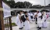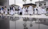 Sejumlah calon jamaah haji bersiap untuk melakukan manasik haji di halaman Masjid Pusdai, Kota Bandung, Kamis (26/5/2022). Sebanyak 236 calon jamaah haji asal Jawa Barat mengikuti manasik haji sebelum pemberangkatan ke Tanah Suci sebagai pembekalan terkait pemahaman tata cara pelaksanaan ibadah. Foto: Republika/Abdan Syakura (FOTO : REPUBLIKA/ABDAN SYAKURA)