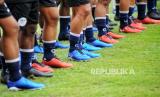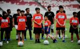 Sejumlah pemain mengikuti coaching clinic bersama mantan pesepakbola Timnas Jerman Mesut Ozil di Stadion Utama Gelora Bung Karno (SUGBK), Jakarta, Kamis (26/5/2022). Dalam kunjungannya ke Indonesia, Eks bintang Arsenal dan Real Madrid tersebut memberikan coaching clinic kepada 47 anak-anak dan remaja di Jakarta. Sebelumnya, dalam lawatannya ke Indonesia, Mesut Ozil telah melakukan kerjasama bersama Kementerian Pariwisata dan Ekonomi Kreatif untuk melakukan promosi produk ekonomi kreatif serta mengunjungi pabrik Concave Indonesia di Tangerang, Banten. Republika/Thoudy Badai (FOTO : Republika/Thoudy Badai)