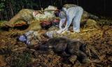 Dokter Hewan melakukan nekropsi bangkai gajah sumatera (Elephas maximus sumtranus) berjenis kelamin betina dan janinnya yang ditemukan mati di kawasan konsesi PT Riau Abadi Lestari, Desa Koto Pait Beringin, Kecamatan Talang Muandau, Kabupaten Bengkalis, Riau, Kamis (26/5/2022) dini hari. Gajah sumatera berusia 25 tahun dan dalam kondisi mengandung 22 bulan tersebut ditemukan mati pada Rabu (25/5), dan petugas sedang melakukan pemeriksaan sample organ satwa agar dapat diketahui penyebab kematiannya. (FOTO : ANTARA/BBKSDA Riau)