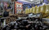 Pedagang menata buah kurma di pusat oleh-oleh haji dan umrah di kawasan Pasar Baru, Jalan Otto Iskandar Dinata, Kota Bandung, Jumat (27/5/2022). Pedagang di pasar tersebut menyatakan jelang pemberangkatan jamaah haji di Indonesia, omzet penjualan oleh-oleh haji dan umrah meningkat 60 persen hingga 80 persen dibandingkan dengan dua tahun terakhir yang terdampak pandemi Covid-19. Foto: Republika/Abdan Syakura (FOTO : REPUBLIKA/ABDAN SYAKURA)