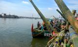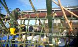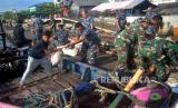 REPUBLIKA.CO.ID, SEMARANG -- Aparat gabungan dan nelayan mengangkut karung pasir di Tambaklorok, Semarang, Jawa Tengah, Jumat (27/5/2022). Aparat gabungan kembali melanjutkan pembangunan tanggul darurat di Pelabuhan Tanjung Emas. Hingga Jumat (27/5/2022) kurang lebih 5.600 karung pasir digunakan untuk tanggul darurat di kawasan Lamicitra.