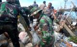 Aparat gabungan membangun tanggul darurat di Pelabuhan Tanjung Emas, Semarang, Jawa Tengah, Jumat (27/5/2022). Aparat gabungan kembali melanjutkan pembangunan tanggul darurat di Pelabuhan Tanjung Emas. Hingga Jumat (27/5/2022) kurang lebih 5.600 karung pasir digunakan untuk tanggul darurat di kawasan Lamicitra. (FOTO : Wihdan Hidayat / Republika)
