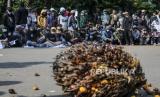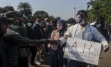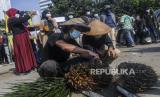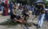 Sejumlah massa yang tergabung dalam Barisan Masyarakat Anti Korupsi, Kolusi dan Nepotisme (BASMI KKN) melakukan aksi teatrikal di kawasan Patung Kuda, Jakarta, Jumat (27/5/2022). Dalam aksi tersebut mereka menuntut pemerintah untuk mengatasi lonjakan harga dan kelangkaan minyak goreng di Indonesia serta menyelesaikan kasus pemberian fasilitas ekspor Crude Palm Oil (CPO). (FOTO : Republika/Putra M. Akbar)