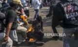 Seorang massa aksi yang tergabung dalam Barisan Masyarakat Anti Korupsi, Kolusi dan Nepotisme (BASMI KKN) terbakar saat melakukan demo di kawasan Patung Kuda, Jakarta, Jumat (27/5/2022). Dalam aksi tersebut mereka menuntut pemerintah untuk mengatasi lonjakan harga dan kelangkaan minyak goreng di Indonesia serta menyelesaikan kasus pemberian fasilitas ekspor Crude Palm Oil (CPO). Republika/Putra M. Akbar (FOTO : Republika/Putra M. Akbar)