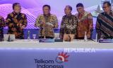 Direktur Utama Telkom Ririek Adriansyah (kedua kiri), Direktur Wholesale & International Service Bogi Witjaksono (kiri), Direktur Keuangan & Manajemen Risiko Heri Supriadi (tengah), Direktur Human Capital Management Afriwandi (kedua kanan), dan Direktur Strategic Portfolio Budi Setyawan Wijaya (kanan) berbincang usai mengikuti Rapat Umum Pemegang Saham Tahunan (RUPST) Tahun Buku 2021 PT Telkom Indonesia di Jakarta, Jumat (27/5/2022). Pemegang saham PT Telkom Indonesia Tbk (TLKM) menyetujui pembagian dividen tunai sebesar Rp 14,86 triliun atau setara 60 persen dari laba bersih perseroan tahun buku 2021, sedangkan 40 persen atau Rp 9,9 triliun akan digunakan sebagai laba ditahan dan digunakan untuk pengembangan usaha perseroan di bidang digital connectivity serta digital services, di antaranya penguatan data center dan kapabilitas cloud. (FOTO : ANTARA FOTO/Fauzan)