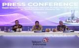 Direktur Utama Telkom Ririek Adriansyah (tengah), Direktur Wholesale & International Service Bogi Witjaksono (kiri), Direktur Keuangan & Manajemen Risiko Heri Supriadi (kanan) menjawab pertanyaan wartawan usai melaksanakan Rapat Umum Pemegang Saham Tahunan (RUPST) Tahun Buku 2021 PT Telkom Indonesia di Jakarta, Jumat (27/5/2022). Pemegang saham PT Telkom Indonesia Tbk (TLKM) menyetujui pembagian dividen tunai sebesar Rp 14,86 triliun atau setara 60 persen dari laba bersih perseroan tahun buku 2021, sedangkan 40 persen atau Rp 9,9 triliun akan digunakan sebagai laba ditahan dan digunakan untuk pengembangan usaha perseroan di bidang digital connectivity serta digital services, di antaranya penguatan data center dan kapabilitas cloud. (FOTO : ANTARA FOTO/Fauzan)