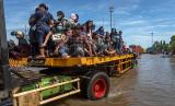 Sejumlah karyawan kawasan industri pelabuhan menumpang truk trailer untuk menerobos banjir limpasan air laut ke daratan atau rob di kawasan Pelabuhan Tanjung Emas Semarang, Jawa Tengah, Jumat (27/5/2022). Karyawan sejumlah pabrik setempat mulai membersihkan sisa-sisa banjir rob di dalam pabrik yang berangsur surut, meskipun air rob masih merendam sejumlah titik akses keluar - masuk kawasan industri pelabuhan dengan ketinggian bervariasi hingga sekitar 70 sentimeter. (FOTO : ANTARA/Aji Styawan)