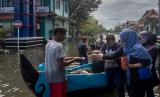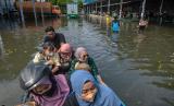 Sejumlah karyawan membayar sewa perahu bermotor Rp10 ribu per orang untuk menerobos banjir limpasan air laut ke daratan atau rob di kawasan industri Pelabuhan Tanjung Emas Semarang, Jawa Tengah, Jumat (27/5/2022). Karyawan sejumlah pabrik setempat mulai membersihkan sisa-sisa banjir rob di dalam pabrik yang berangsur surut, meskipun air rob masih merendam sejumlah titik akses keluar - masuk kawasan industri pelabuhan dengan ketinggian bervariasi hingga sekitar 70 sentimeter. (FOTO : ANTARA/Aji Styawan)