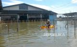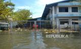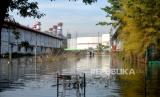 Banjir Rob masih menggenangi kawasan berikat di Pelabuhan Tanjung Emas, Semarang, Jawa Tengah, Jumat (27/5/2022). Pekerja mulai masuk kembali untuk membersihkan pabrik sisa banjir rob akibat tanggul jebol. Meski banjir mulai surut, beberapa titik di Pelabuhan Tanjung Emas masih tergenang air rob dengan ketinggian maksimal sepinggang orang dewasa. (FOTO : Wihdan Hidayat / Republika)