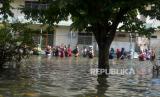 Pekerja pelabuhan menerobos banjir rob di dalam Pelabuhan Tanjung Emas, Semarang, Jawa Tengah, Jumat (27/5/2022). Pekerja mulai masuk kembali untuk membersihkan pabrik sisa banjir rob akibat tanggul jebol. Meski banjir mulai surut, beberapa titik di Pelabuhan Tanjung Emas masih tergenang air rob dengan ketinggian maksimal sepinggang orang dewasa. (FOTO : Wihdan Hidayat / Republika)