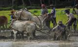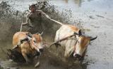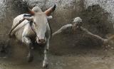 REPUBLIKA.CO.ID,TANAH DATAR -- Seorang joki memacu sapinya saat mengikuti atraksi Pacu Jawi di Nagari III Koto, Rambatan, Kabupaten Tanah Datar, Sumatera Barat, Sabtu (28/5/2022).