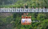 Wisatawan menyeberang menggunakan gondola di Dusun Girpasang, Klaten, Jawa Tengah, Senin (30/5/2022). Usai pembangunan jembatan gantung dengan panjang 130 meter Dusun Girpasang berubah dari desa terpencil menjadi desa yang menjadi tujuan wisata. Dusun terdekat dengan Gunung Merapi ini menjadi lokasi wisata baru bagi warga Yogyakarta dan Klaten. Beberapa restoran dan warung kopi milik warga juga banyak berdiri di sekitar lokasi jembatan gantung. (FOTO : Wihdan Hidayat / Republika)