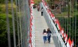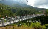 Wisatawan menyeberang menggunakan jembatan gantung di Dusun Girpasang, Klaten, Jawa Tengah, Senin (30/5/2022). Usai pembangunan jembatan gantung dengan panjang 130 meter Dusun Girpasang berubah dari desa terpencil menjadi desa yang menjadi tujuan wisata. Dusun terdekat dengan Gunung Merapi ini menjadi lokasi wisata baru bagi warga Yogyakarta dan Klaten. Beberapa restoran dan warung kopi milik warga juga banyak berdiri di sekitar lokasi jembatan gantung. (FOTO : Wihdan Hidayat / Republika)