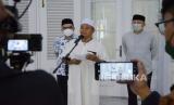 Wakil Gubernur Jawa Barat Uu Ruzhanul Ulum menyampaikan keterangan pers terkait perpanjangan izin Gubernur Jawa Barat Ridwan Kamil untuk mendampingi upaya pencarian pura sulungnya Emmeril Khan Mumtadz (Eril) usai doa bersama untuk Eril, di Gedung Pakuan, Kota Bandung. Senin (30/5). Untuk sementara kepemimpinan pemerintahan di Jawa Barat dilimpahkan pada Wakil Gubernur Jawa Barat Uu Ruhzhanul Ulum sebagai Pelaksana Harian (Plh) Gubernur Jawa Barat. (FOTO : Edi Yusuf/Republika)